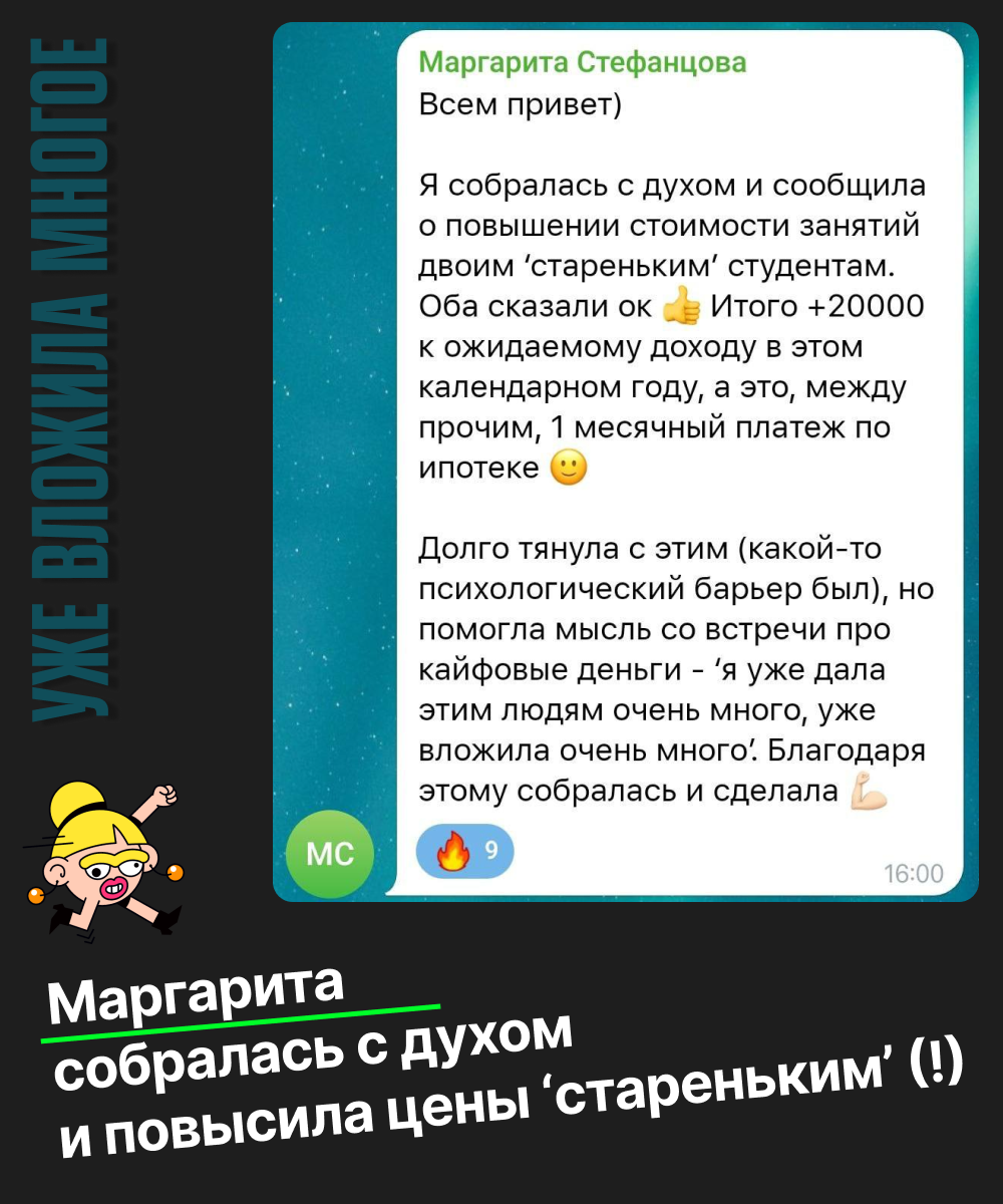 Маргарита собралась с духом и сообщила о повышении стоимости занятий двоим «стареньким» студентам. Оба сказали «ок» 👍